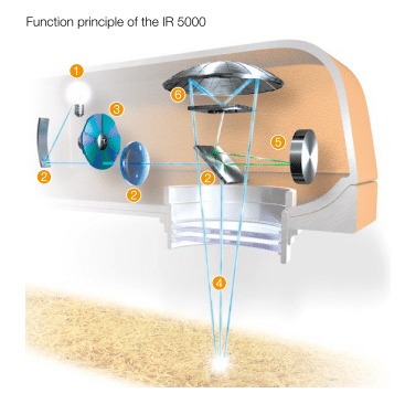 The non-contact inline measuring system GreCon MOISTURECONTROL IR works with an optical measurement transducer. Light in the NIR region is used, which is absorbed by the material moisture. This means: The more moisture in the material being measured, the less light is reflected. A light beam, which is emitted by a halogen lamp (1), is divided into several measuring beams (4) and reference beams (5) by means of a mirror-lens combination (2).The rays are led through a filter wheel (3) to filter out the excessive spectral regions of the light. The remaining rays of the NIR region are projected onto the material to be measured. The reflected light, the intensity of which depends on the moisture content, is compared with the reference beams in the measuring head and used to calculate the material moisture. Due to the division into several measuring and reference beams and the dual-detector principle (6), high system reliability and measuring accuracy – independent of external influences – is ensured.